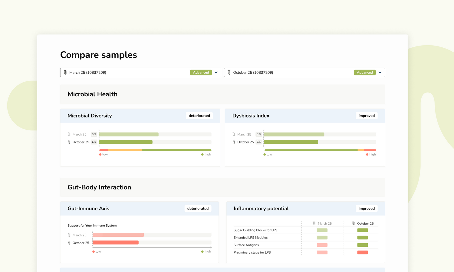 Gain insights into the current state of your gut microbiome, track changes, and easily compare your test results within the myBioma platform.