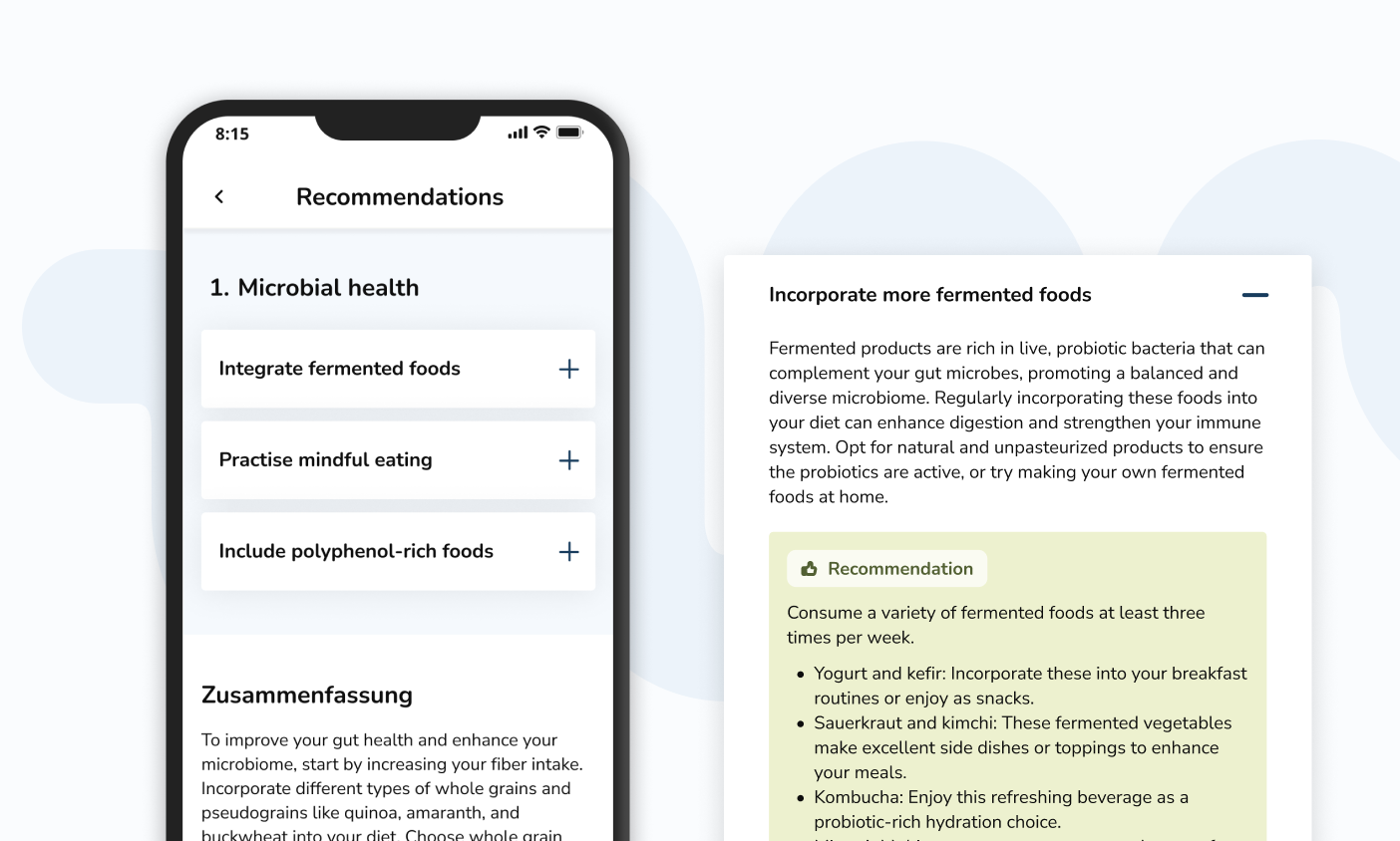 By analysing your individual microbiome in detail, we can create personalised recommendations based on your results to help you improve your gut health. We know that changing your diet can be a challenge, so your recommendations are formulated and presented in an easy-to-understand way so that you can easily integrate them into your everyday life. If you have any questions, you can always contact our support team.