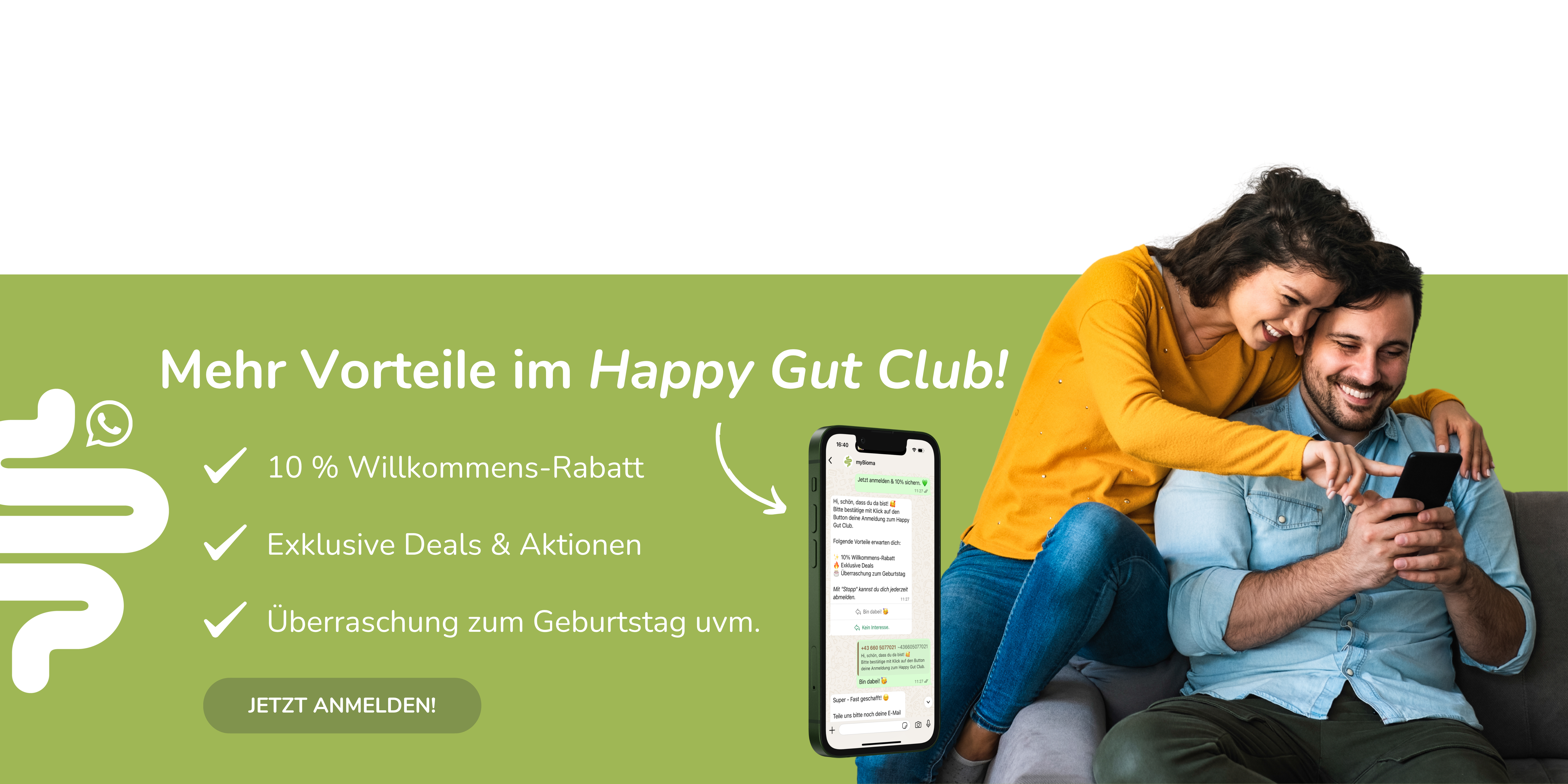 Du möchtest Produkt-News als Erste*r erfahren und exklusive Rabatte, Rezepte und mehr erhalten? Dann werde jetzt Teil unseres HAPPY GUT CLUBs auf WhatsApp: myBioma Happy Gut Club