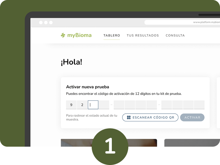 Recibirás tus resultados en un formato claramente organizado en la plataforma myBioma. Puedes acceder a ellos en cualquier momento y lugar desde tu smartphone, tableta u ordenador. Esto significa que siempre tendrás tus resultados a mano y que podrás integrar tus recomendaciones en tu vida cotidiana con mayor facilidad. Se te informará del estado de tu muestra y de la finalización de tus resultados por correo electrónico.