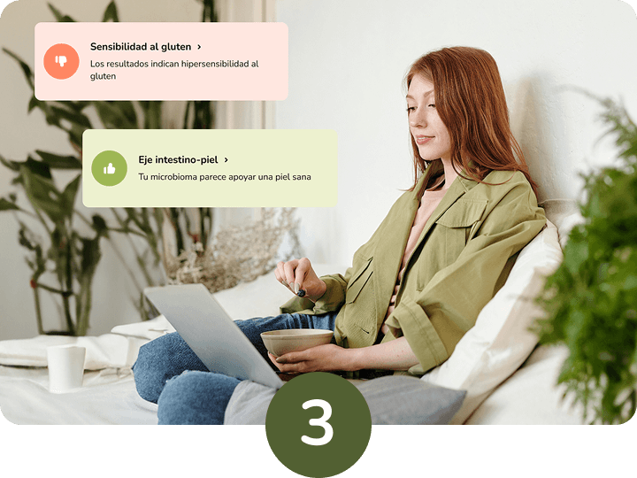 Analizando detalladamente tu microbioma individual, podemos crear recomendaciones personalizadas basadas en tus resultados para ayudarte a mejorar tu salud intestinal. Sabemos que cambiar tu dieta puede ser un reto, por lo que tus recomendaciones se formulan y presentan de forma fácil de entender, para que puedas integrarlas fácilmente en tu vida cotidiana. Si tienes alguna duda, siempre puedes ponerte en contacto con nuestro equipo de asistencia.