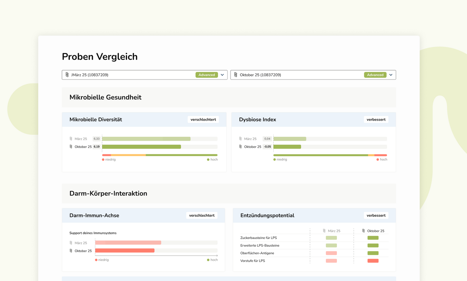 Erhalte einen Überblick über den aktuellen Zustand deines Darm-Mikrobioms, verfolge deine Veränderungen und vergleiche deine Testergebnisse ganz einfach in der myBioma Plattform.