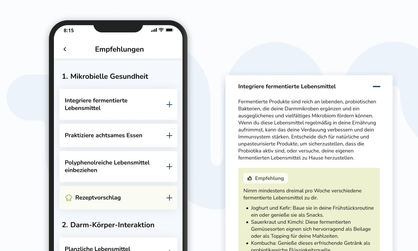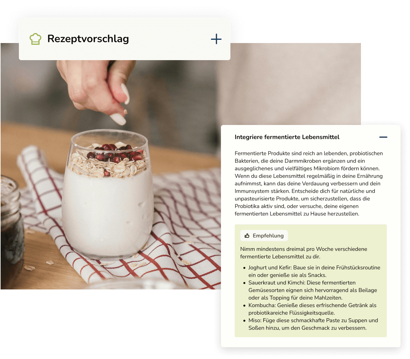 Nutze individuelle Ernährungstipps und Rezeptideen basierend auf deinem Testergebnis, um die langfristige Gesundheit deines Darms zu fördern.