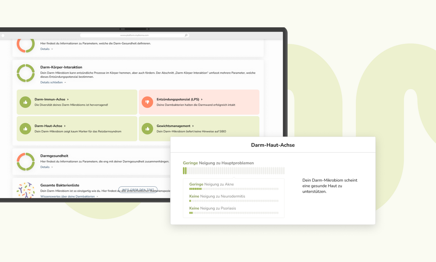 Der Mikrobiom-Bericht von myBioma gibt dir Einblick in die Welt deines persönlichen Mikrobioms, zeigt Gesundheits-Zusammenänge auf und gibt dir auf deine Bedürfnisse abgestimmte Ernährungsempfehlungen.