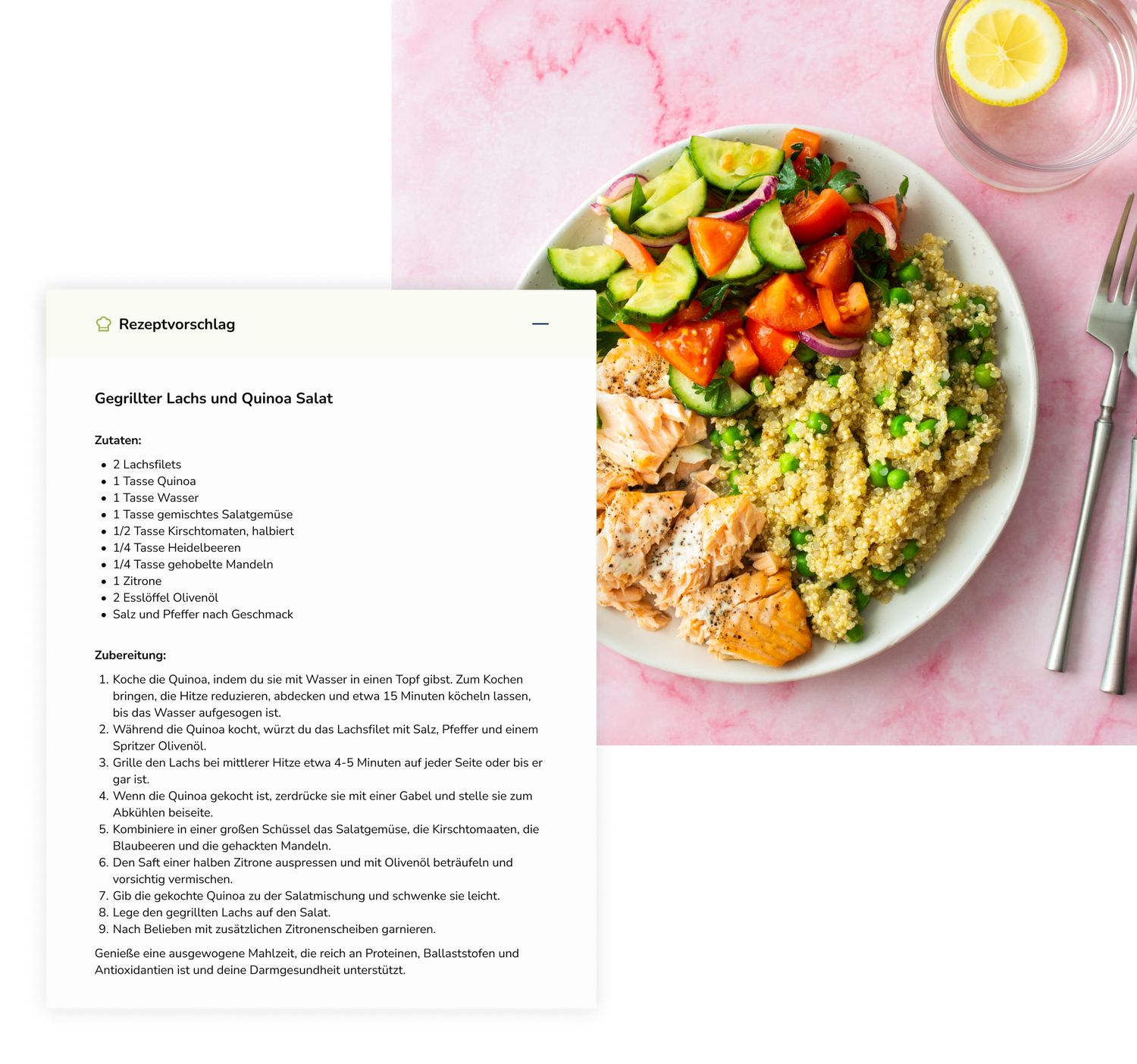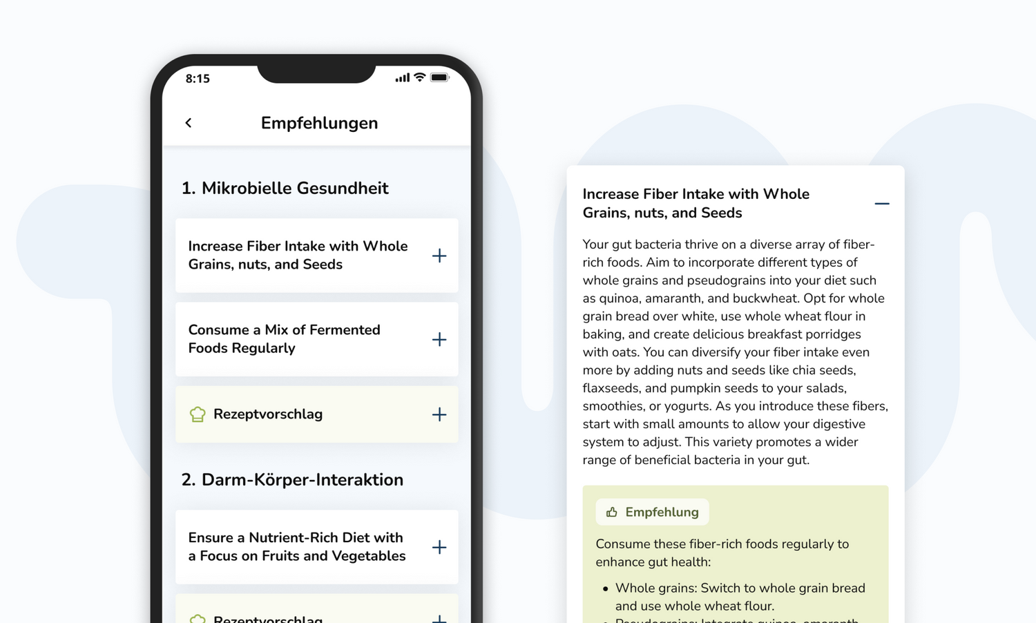 Nutze individuelle Ernährungstipps und Rezeptideen basierend auf deinem Testergebnis, um die langfristige Gesundheit deines Darms zu fördern.