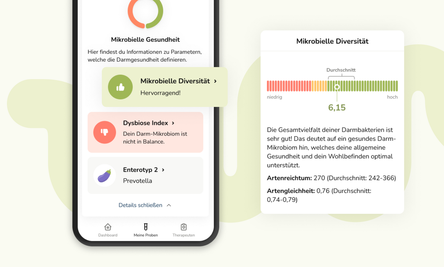 Die Diversität deines Darm-Mikrobioms beschreibt, wie viele verschiedene Bakterienarten vorhanden sind und wie gleichmäßig sie verteilt sind. Sie ist ein entscheidender Faktor für die Gesundheit des Mikrobioms. Eine niedrige Diversität kann mit Gesundheitsproblemen wie entzündlichen Darmerkrankungen, Fettleibigkeit, Stoffwechselstörungen und Autoimmunerkrankungen zusammenhängen. Daher ist es wertvoll, die Diversität des eigenen Mikrobioms zu kennen, um Hinweise auf mögliche gesundheitliche Risiken zu erhalten.