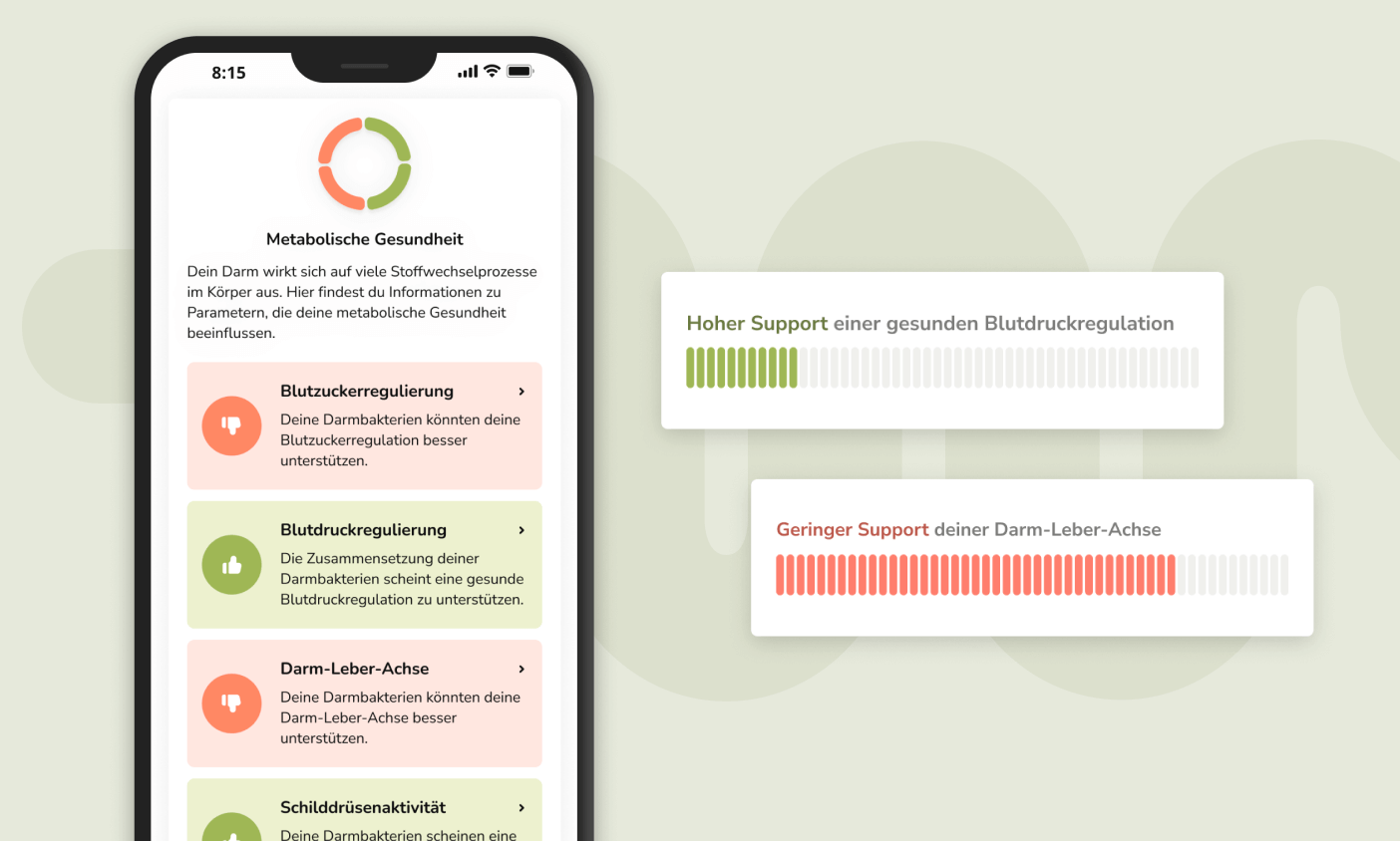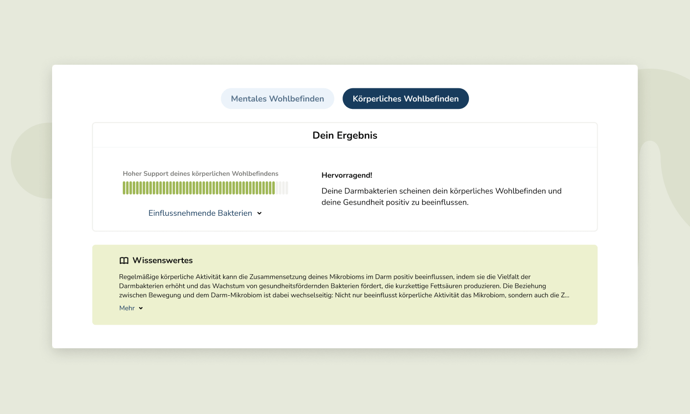 Zusammen mit deinem umfangreichen Einblick in das Profil deiner Bakterienzusammensetzung und dessen Auswirkungen auf deine Gesundheit, erhältst zu zusätzlich auf deinen Darm abgestimmte Ernährungsempfehlungen. Diese sind leicht in deinen Alltag integrierbar und helfen dir das Gleichgewicht deines Mikrobioms wieder herzustellen und es aufrecht zu erhalten.
